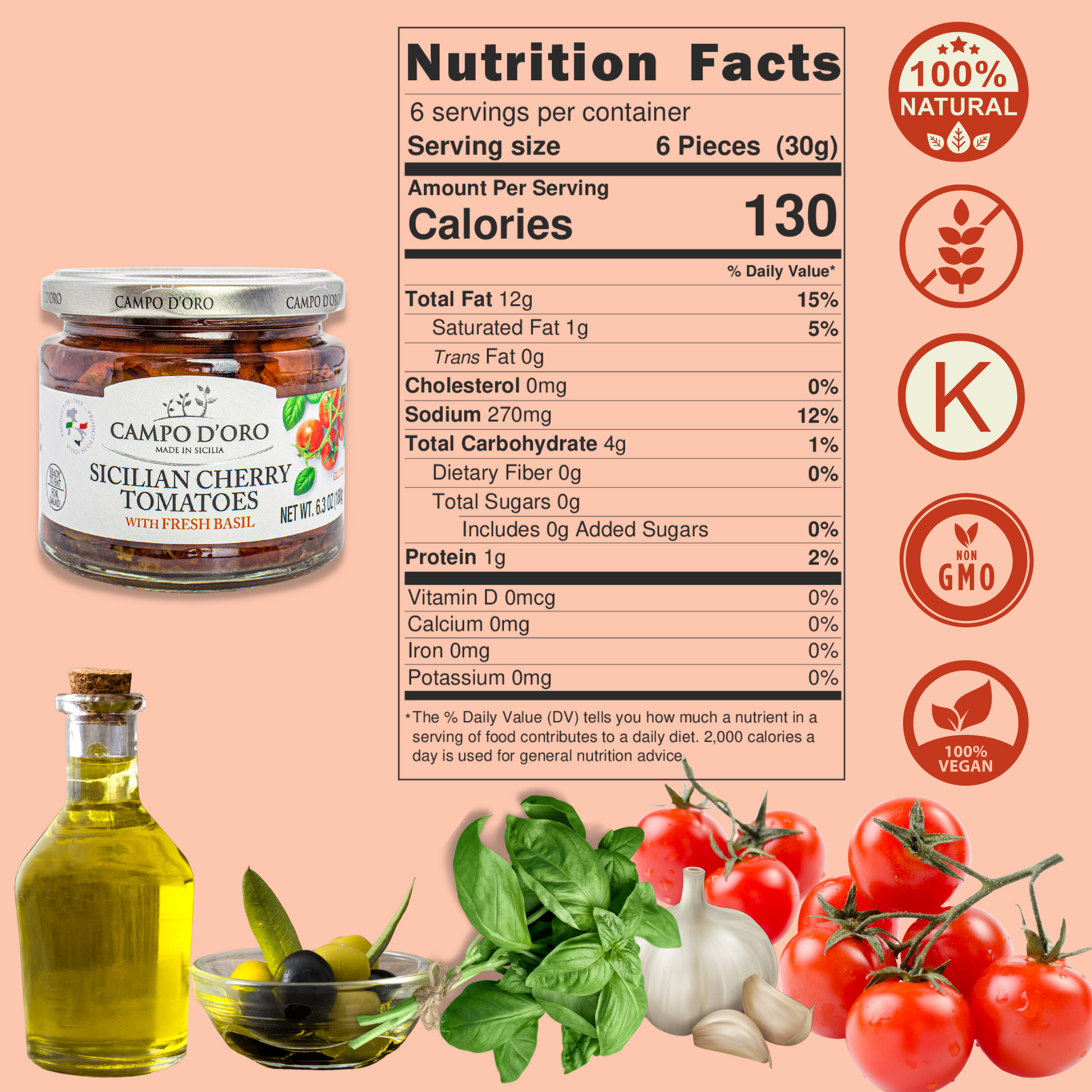 Campo D’Oro, Sundried Cherry Tomatoes in oil made with fresh basil , Glass Jar 6.35 oz.